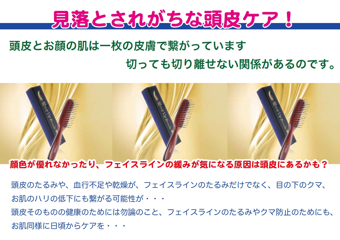 頭皮とお顔の肌は、一枚の皮膚で繋がっており、切っても切り離せない関係にあります 。頭皮のたるみや血行不足は、そのままお顔のたるみやクマ、ハリの低下に繋がります 『髪わざ Up Brush』で頭皮をケアすることは、お顔のエイジングケアそのものなのです
